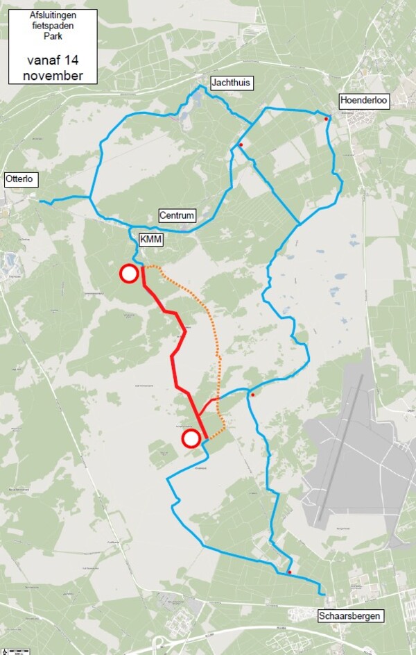 In verband met de vernieuwing van het wegdek is het fietspad op het traject tussen het Kröller-Müller Museum en de Oud-Reemsterweg gesloten tot uiterlijk 11 december. Ook de verbinding tussen de Wildbaanweg en het doorgaande fietspad is voor fietsers ontoegankelijk in deze periode. Gebruikers worden omgeleid over de Wildbaanweg via de rode stippelroute.